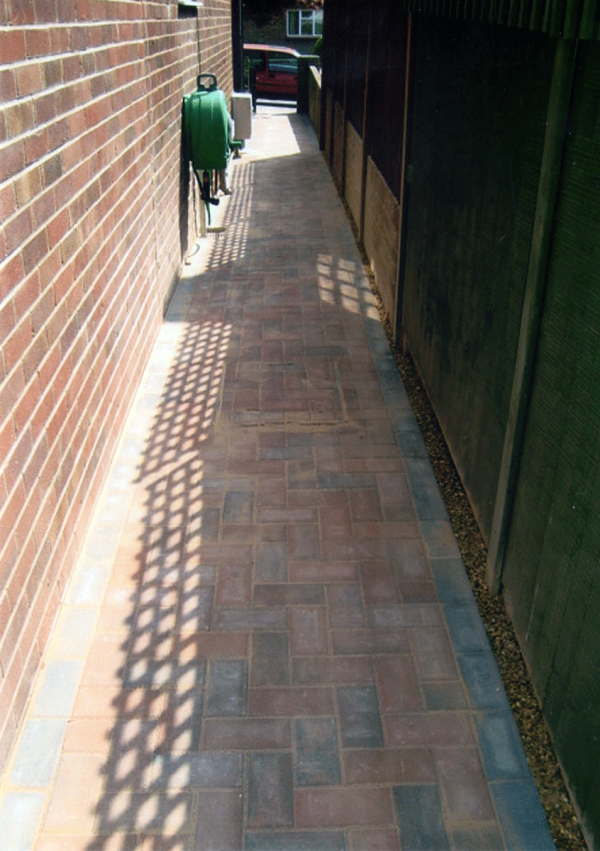 Mixed coloured brick paved path.