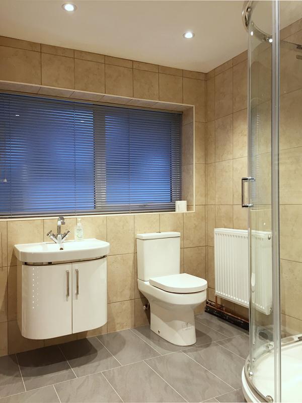 Finished bathroom. The toilet was moved and the boxing removed to make more space. The bath was not required, so was moved.